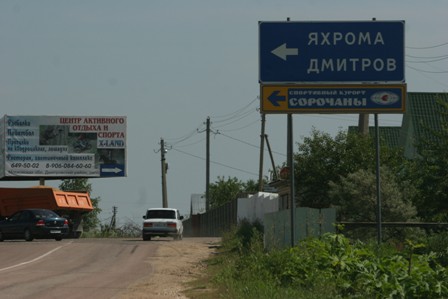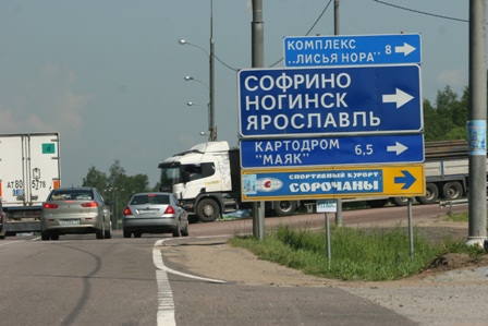 На 54 км Дмитровского шоссе (после п. Икша) следует повернуть направо (указатель на Ярославль, Софрино, Ногинск, Сорочаны),