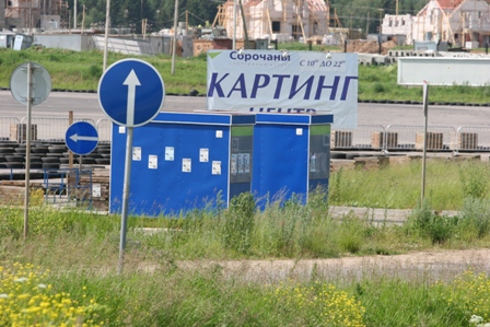 Через 100 метров слева вы увидите большую асфальтовую площадку, часть которой занимает картодром:
